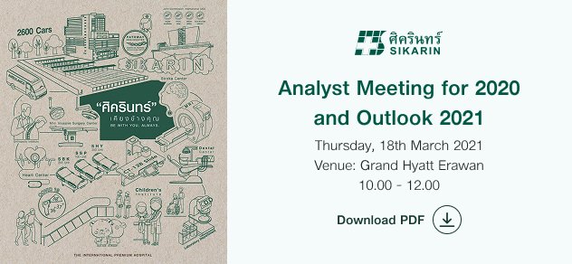 On 18 March 2021, Sikarin Public Company Limited held Analyst Meeting for 2020 and Outlook 2021 Overview and direction of business in 2021 with Dr. Atirat Charoonsri, Managing Director, Mr. Suriyan Kojonroj Deputy Managing Director and Mr. Sanee Krajangsri, Chief Financial Officer of Sikarin Public Company Limited participated in the communication for the participating analysts at the Grand Ballroom, Grand Hyatt Erawan Bangkok Hotel.